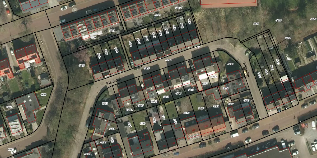 Het perceel waarop Kieskoel 15 staat heeft een oppervlakte van 174 m². Dit is een middelgroot perceel. De perceeloppervlakte wordt geregistreerd door het Kadaster. Gedetailleerde informatie over de maten van dit perceel kunt u vinden in het rapport Kadastrale kaart met maatvoering van Kieskoel 15.