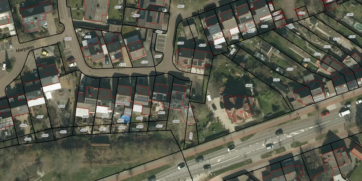 Het perceel waarop Marjolein 20 staat heeft een oppervlakte van 343 m². Dit is een groot perceel. De perceeloppervlakte wordt geregistreerd door het Kadaster. Gedetailleerde informatie over de maten van dit perceel kunt u vinden in het rapport Kadastrale kaart met maatvoering van Marjolein 20.