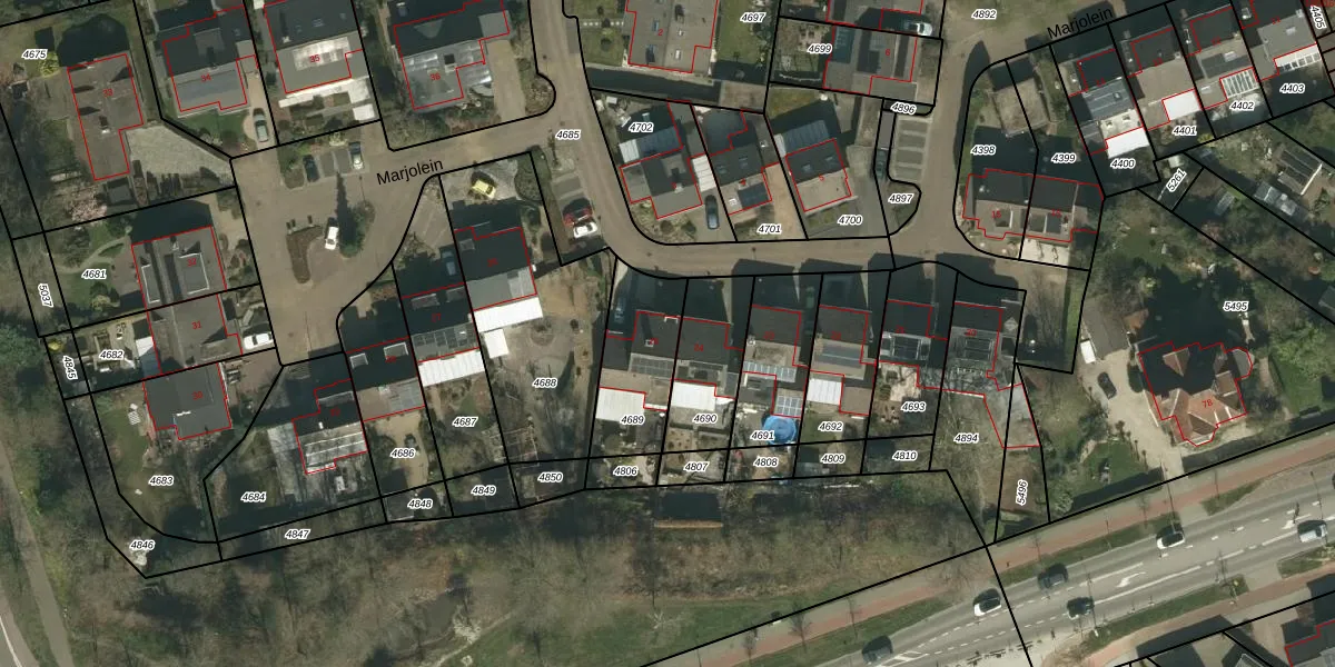 Het perceel waarop Marjolein 25 staat heeft een oppervlakte van 305 m². Dit is een groot perceel. De perceeloppervlakte wordt geregistreerd door het Kadaster. Gedetailleerde informatie over de maten van dit perceel kunt u vinden in het rapport Kadastrale kaart met maatvoering van Marjolein 25.