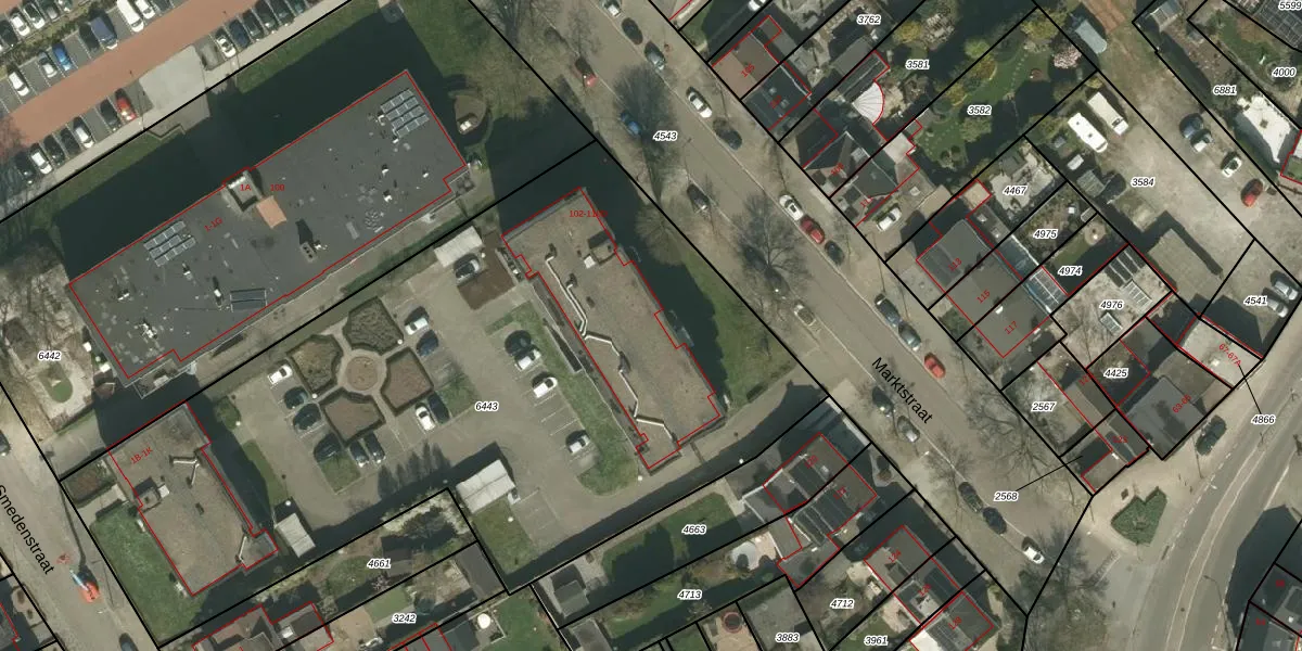 Het perceel waarop Marktstraat 104-B staat heeft een oppervlakte van 4448 m². Dit is een zeer groot perceel. De perceeloppervlakte wordt geregistreerd door het Kadaster. Gedetailleerde informatie over de maten van dit perceel kunt u vinden in het rapport Kadastrale kaart met maatvoering van Marktstraat 104-B.