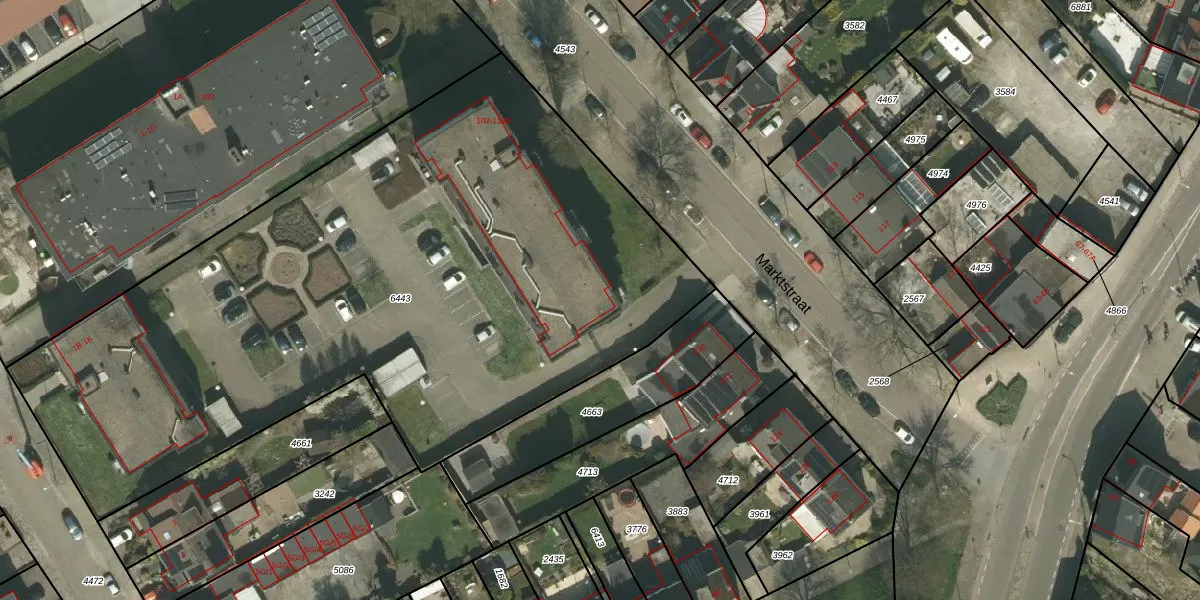 Het perceel waarop Marktstraat 104-D staat heeft een oppervlakte van 4448 m². Dit is een zeer groot perceel. De perceeloppervlakte wordt geregistreerd door het Kadaster. Gedetailleerde informatie over de maten van dit perceel kunt u vinden in het rapport Kadastrale kaart met maatvoering van Marktstraat 104-D.