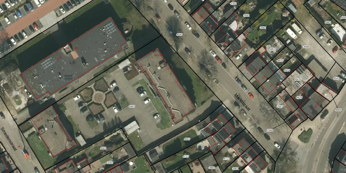 Het perceel waarop Marktstraat 106-B staat heeft een oppervlakte van 4448 m². Dit is een zeer groot perceel. De perceeloppervlakte wordt geregistreerd door het Kadaster. Gedetailleerde informatie over de maten van dit perceel kunt u vinden in het rapport Kadastrale kaart met maatvoering van Marktstraat 106-B.