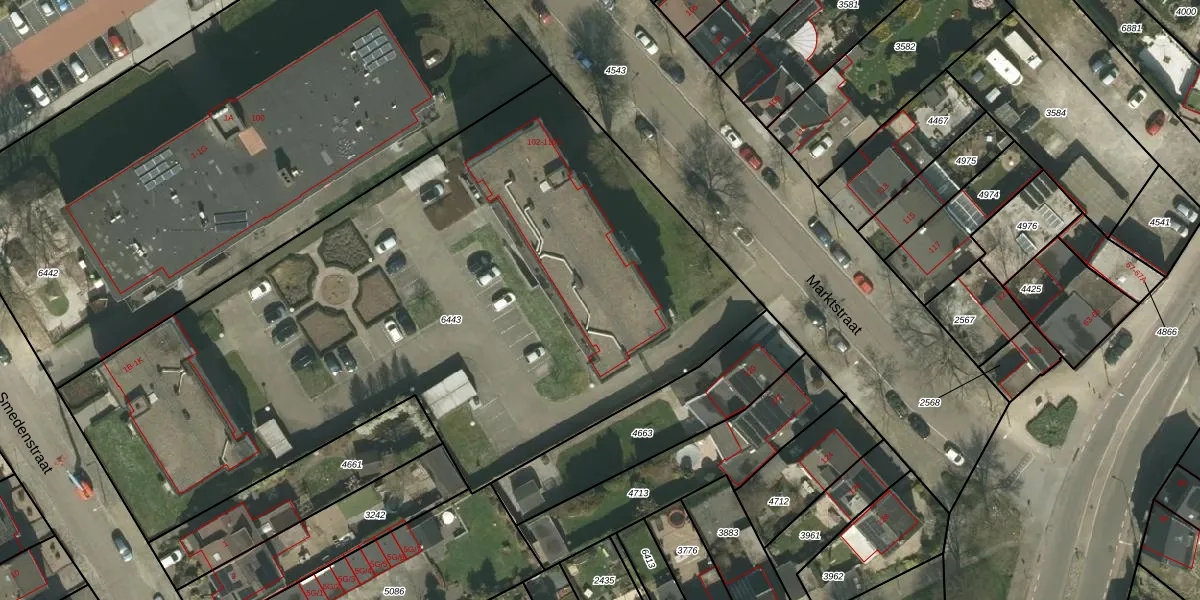 Het perceel waarop Marktstraat 110-C staat heeft een oppervlakte van 4448 m². Dit is een zeer groot perceel. De perceeloppervlakte wordt geregistreerd door het Kadaster. Gedetailleerde informatie over de maten van dit perceel kunt u vinden in het rapport Kadastrale kaart met maatvoering van Marktstraat 110-C.
