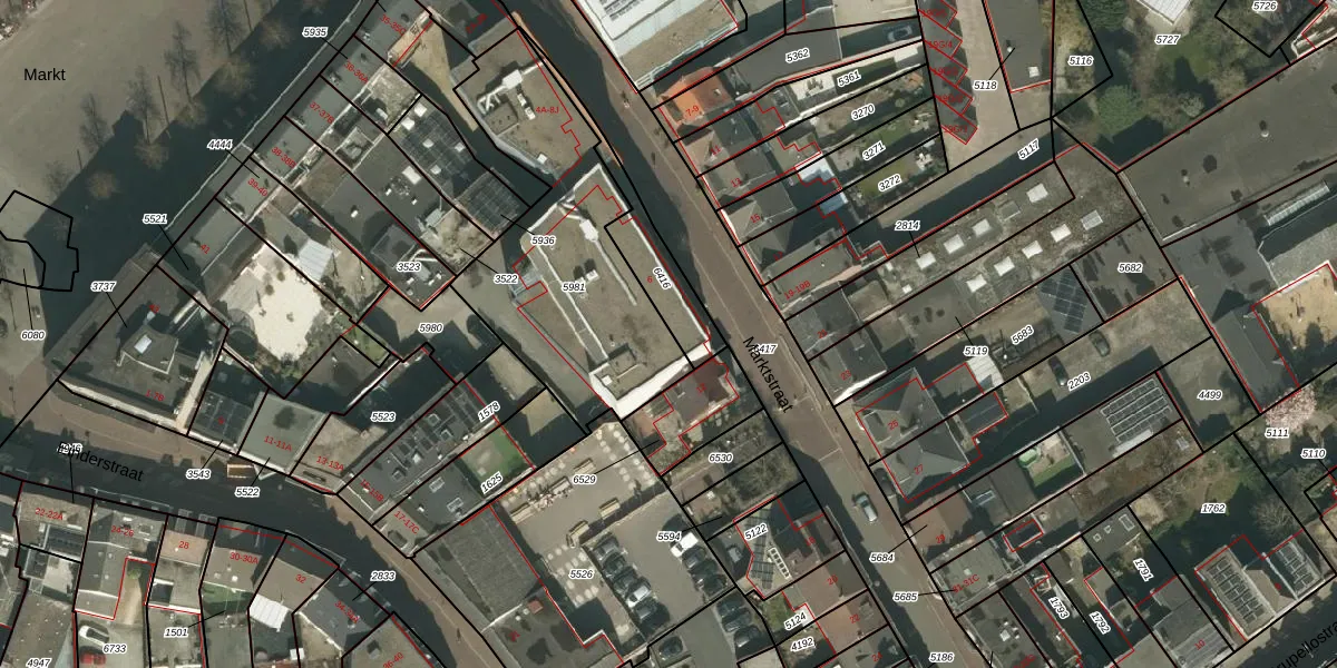 Het perceel waarop Marktstraat 8-D staat heeft een oppervlakte van 1025 m². Dit is een zeer groot perceel. De perceeloppervlakte wordt geregistreerd door het Kadaster. Gedetailleerde informatie over de maten van dit perceel kunt u vinden in het rapport Kadastrale kaart met maatvoering van Marktstraat 8-D.