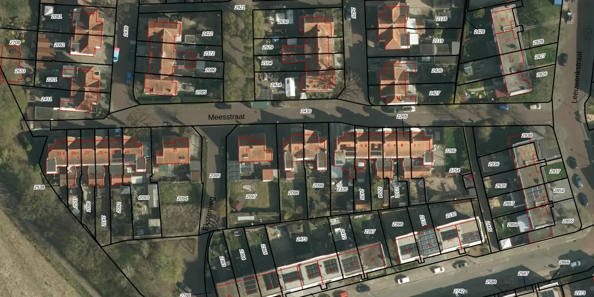 Het perceel waarop Meesstraat 15 staat heeft een oppervlakte van 294 m². Dit is een middelgroot perceel. De perceeloppervlakte wordt geregistreerd door het Kadaster. Gedetailleerde informatie over de maten van dit perceel kunt u vinden in het rapport Kadastrale kaart met maatvoering van Meesstraat 15.