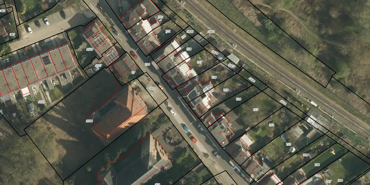 Meuserstraat 108 is gelegen op kadastraal perceel KRD00P716. Deze kadastrale aanduiding is uniek en wordt gebruikt door het Kadaster om eigendomsrechten en andere zakelijke rechten vast te leggen. Het perceel maakt onderdeel uit van de kadastrale gemeente Kerkrade.