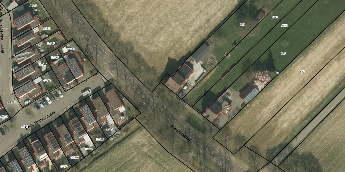 Het perceel waarop Meuserstraat 4 staat heeft een oppervlakte van 1682 m². Dit is een zeer groot perceel. De perceeloppervlakte wordt geregistreerd door het Kadaster. Gedetailleerde informatie over de maten van dit perceel kunt u vinden in het rapport Kadastrale kaart met maatvoering van Meuserstraat 4.