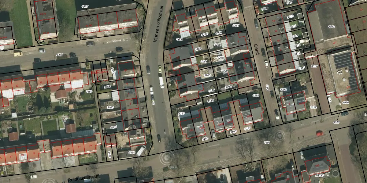 Mgr.van Gilsstraat 2 is gelegen op kadastraal perceel KRD00G3186. Deze kadastrale aanduiding is uniek en wordt gebruikt door het Kadaster om eigendomsrechten en andere zakelijke rechten vast te leggen. Het perceel maakt onderdeel uit van de kadastrale gemeente Kerkrade.