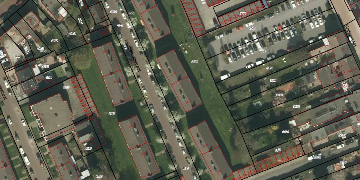 Het perceel waarop Mucherveldstraat 55 staat heeft een oppervlakte van 3800 m². Dit is een zeer groot perceel. De perceeloppervlakte wordt geregistreerd door het Kadaster. Gedetailleerde informatie over de maten van dit perceel kunt u vinden in het rapport Kadastrale kaart met maatvoering van Mucherveldstraat 55.