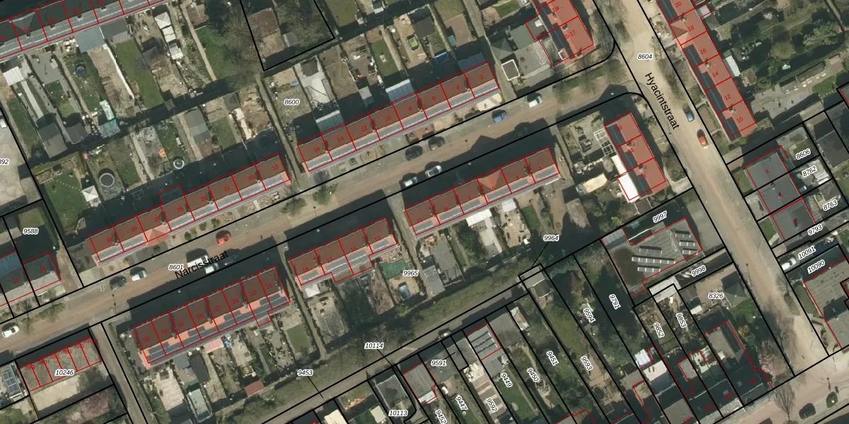 Het perceel waarop Narcisstraat 11 staat heeft een oppervlakte van 4538 m². Dit is een zeer groot perceel. De perceeloppervlakte wordt geregistreerd door het Kadaster. Gedetailleerde informatie over de maten van dit perceel kunt u vinden in het rapport Kadastrale kaart met maatvoering van Narcisstraat 11.