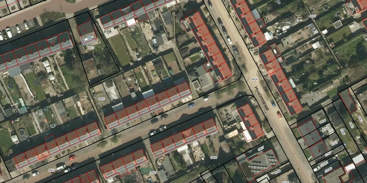 Het perceel waarop Narcisstraat 2 staat heeft een oppervlakte van 8731 m². Dit is een zeer groot perceel. De perceeloppervlakte wordt geregistreerd door het Kadaster. Gedetailleerde informatie over de maten van dit perceel kunt u vinden in het rapport Kadastrale kaart met maatvoering van Narcisstraat 2.