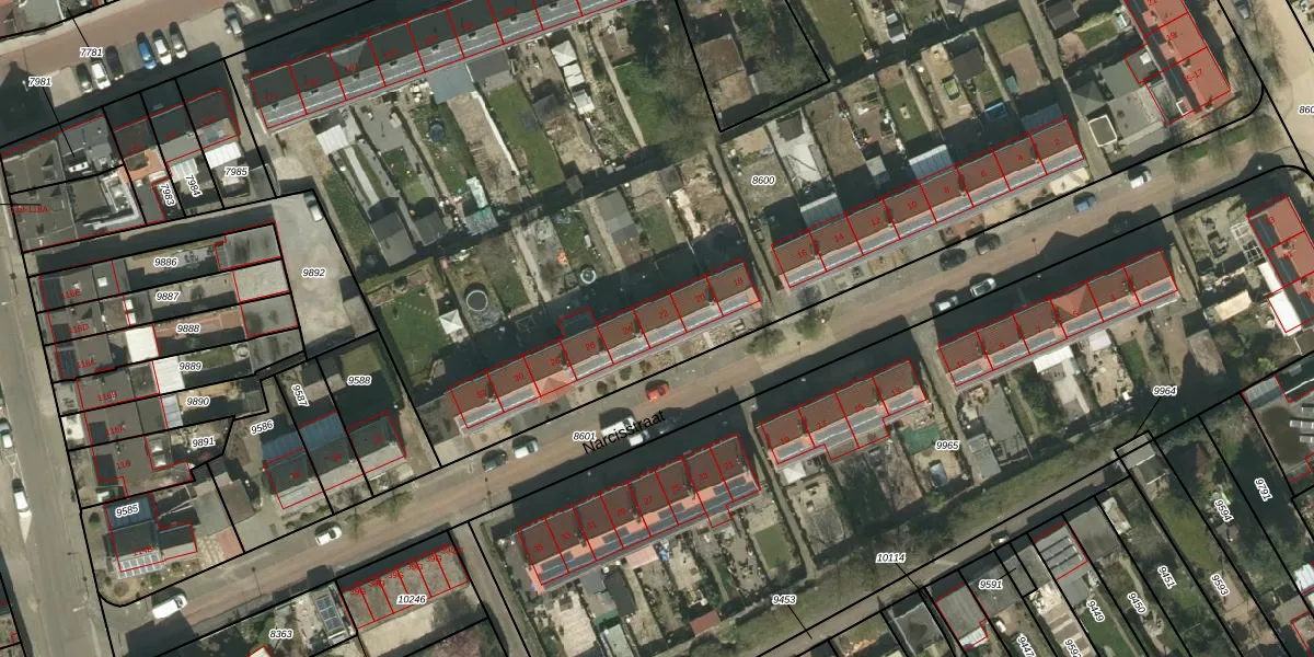 Het perceel waarop Narcisstraat 22 staat heeft een oppervlakte van 8731 m². Dit is een zeer groot perceel. De perceeloppervlakte wordt geregistreerd door het Kadaster. Gedetailleerde informatie over de maten van dit perceel kunt u vinden in het rapport Kadastrale kaart met maatvoering van Narcisstraat 22.