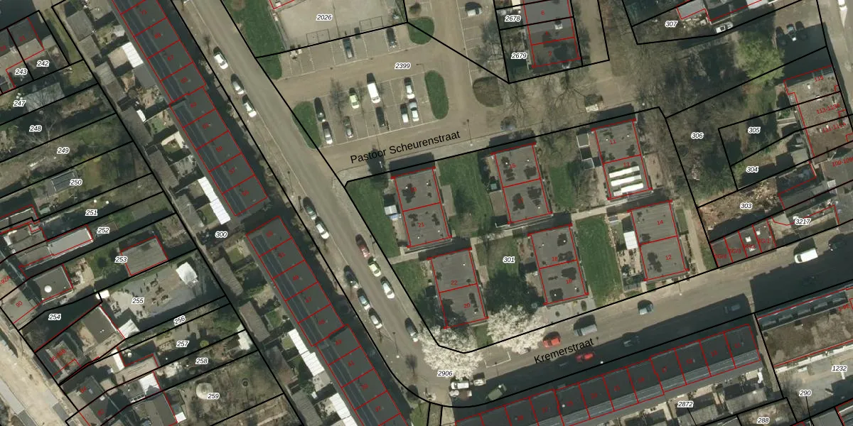 Pastoor Scheurenstraat 21 is gelegen op kadastraal perceel KRD00K301. Deze kadastrale aanduiding is uniek en wordt gebruikt door het Kadaster om eigendomsrechten en andere zakelijke rechten vast te leggen. Het perceel maakt onderdeel uit van de kadastrale gemeente Kerkrade.