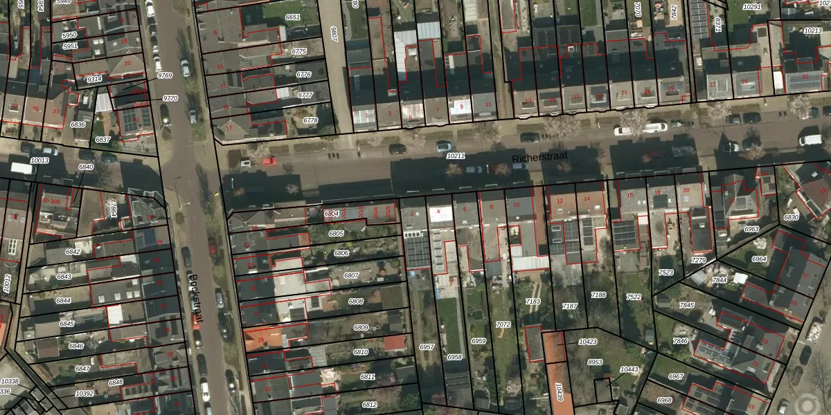 Het perceel waarop Richerstraat 2 staat heeft een oppervlakte van 327 m². Dit is een groot perceel. De perceeloppervlakte wordt geregistreerd door het Kadaster. Gedetailleerde informatie over de maten van dit perceel kunt u vinden in het rapport Kadastrale kaart met maatvoering van Richerstraat 2.