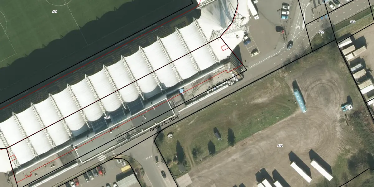 Het perceel waarop Roda J.C. Ring 55 staat heeft een oppervlakte van 2978 m². Dit is een zeer groot perceel. De perceeloppervlakte wordt geregistreerd door het Kadaster. Gedetailleerde informatie over de maten van dit perceel kunt u vinden in het rapport Kadastrale kaart met maatvoering van Roda J.C. Ring 55.