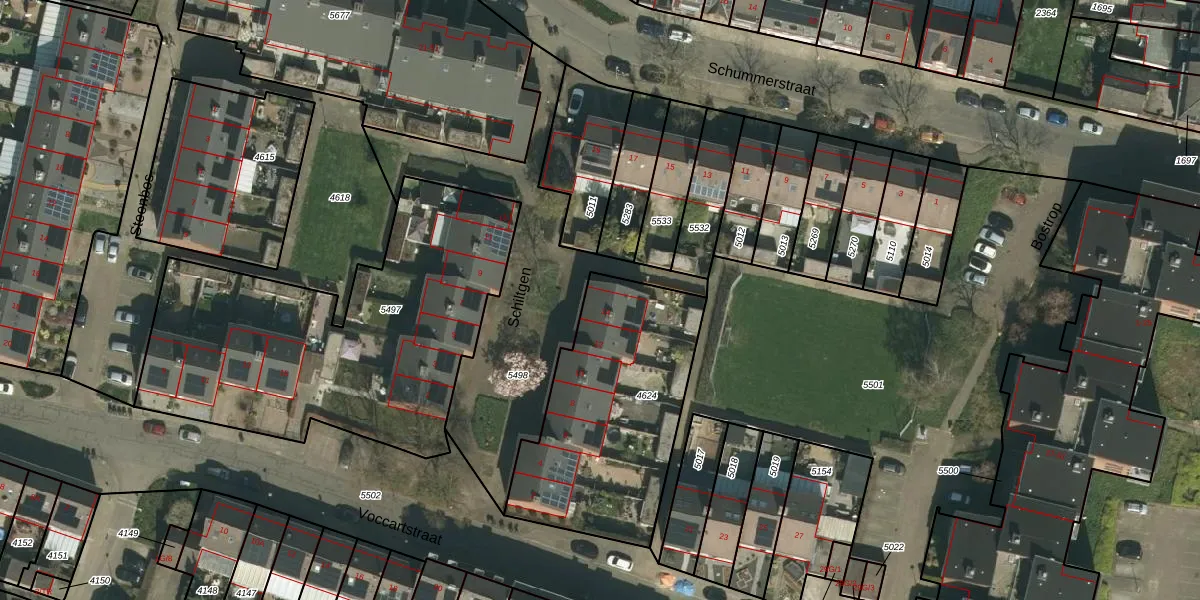 Het perceel waarop Schiltgen 14 staat heeft een oppervlakte van 960 m². Dit is een groot perceel. De perceeloppervlakte wordt geregistreerd door het Kadaster. Gedetailleerde informatie over de maten van dit perceel kunt u vinden in het rapport Kadastrale kaart met maatvoering van Schiltgen 14.