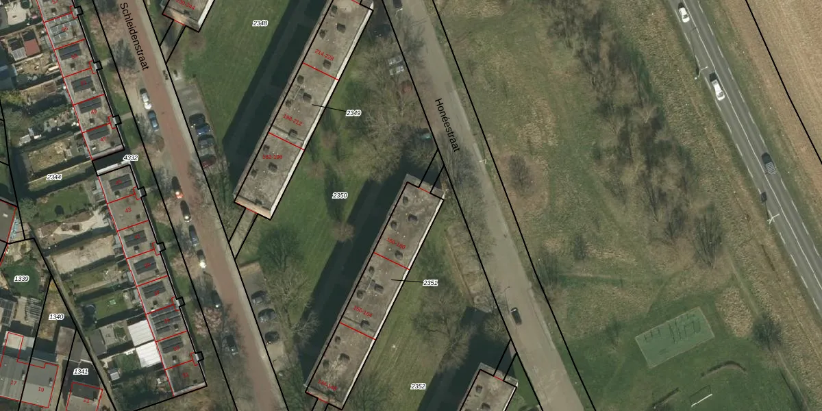 Het perceel waarop Schleidenstraat 168 staat heeft een oppervlakte van 633 m². Dit is een groot perceel. De perceeloppervlakte wordt geregistreerd door het Kadaster. Gedetailleerde informatie over de maten van dit perceel kunt u vinden in het rapport Kadastrale kaart met maatvoering van Schleidenstraat 168.