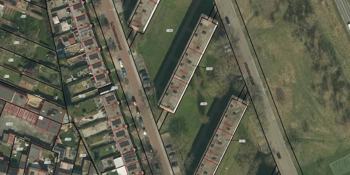 Het perceel waarop Schleidenstraat 192 staat heeft een oppervlakte van 634 m². Dit is een groot perceel. De perceeloppervlakte wordt geregistreerd door het Kadaster. Gedetailleerde informatie over de maten van dit perceel kunt u vinden in het rapport Kadastrale kaart met maatvoering van Schleidenstraat 192.