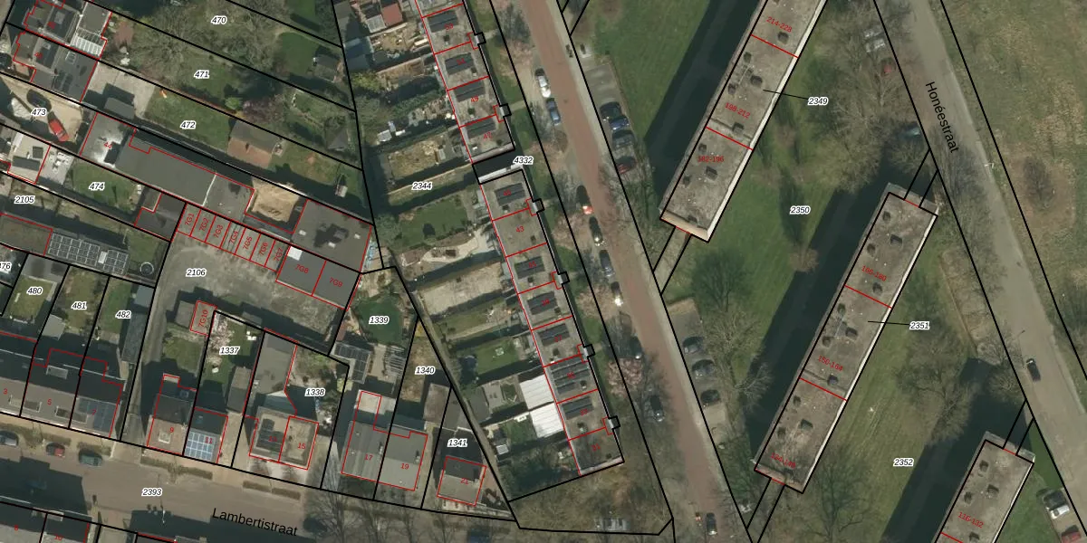 Het perceel waarop Schleidenstraat 41 staat heeft een oppervlakte van 2980 m². Dit is een zeer groot perceel. De perceeloppervlakte wordt geregistreerd door het Kadaster. Gedetailleerde informatie over de maten van dit perceel kunt u vinden in het rapport Kadastrale kaart met maatvoering van Schleidenstraat 41.