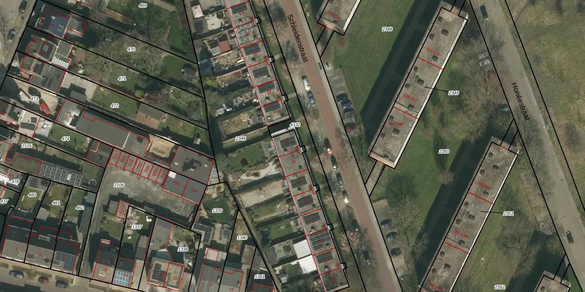 Het perceel waarop Schleidenstraat 45 staat heeft een oppervlakte van 2980 m². Dit is een zeer groot perceel. De perceeloppervlakte wordt geregistreerd door het Kadaster. Gedetailleerde informatie over de maten van dit perceel kunt u vinden in het rapport Kadastrale kaart met maatvoering van Schleidenstraat 45.