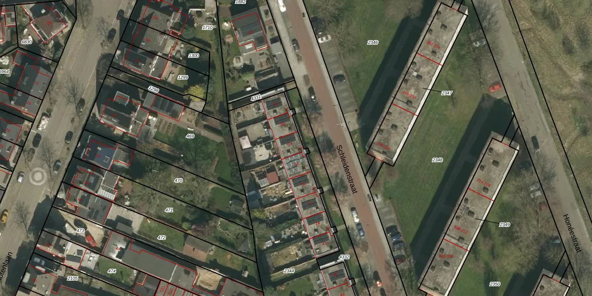 Het perceel waarop Schleidenstraat 57 staat heeft een oppervlakte van 2980 m². Dit is een zeer groot perceel. De perceeloppervlakte wordt geregistreerd door het Kadaster. Gedetailleerde informatie over de maten van dit perceel kunt u vinden in het rapport Kadastrale kaart met maatvoering van Schleidenstraat 57.