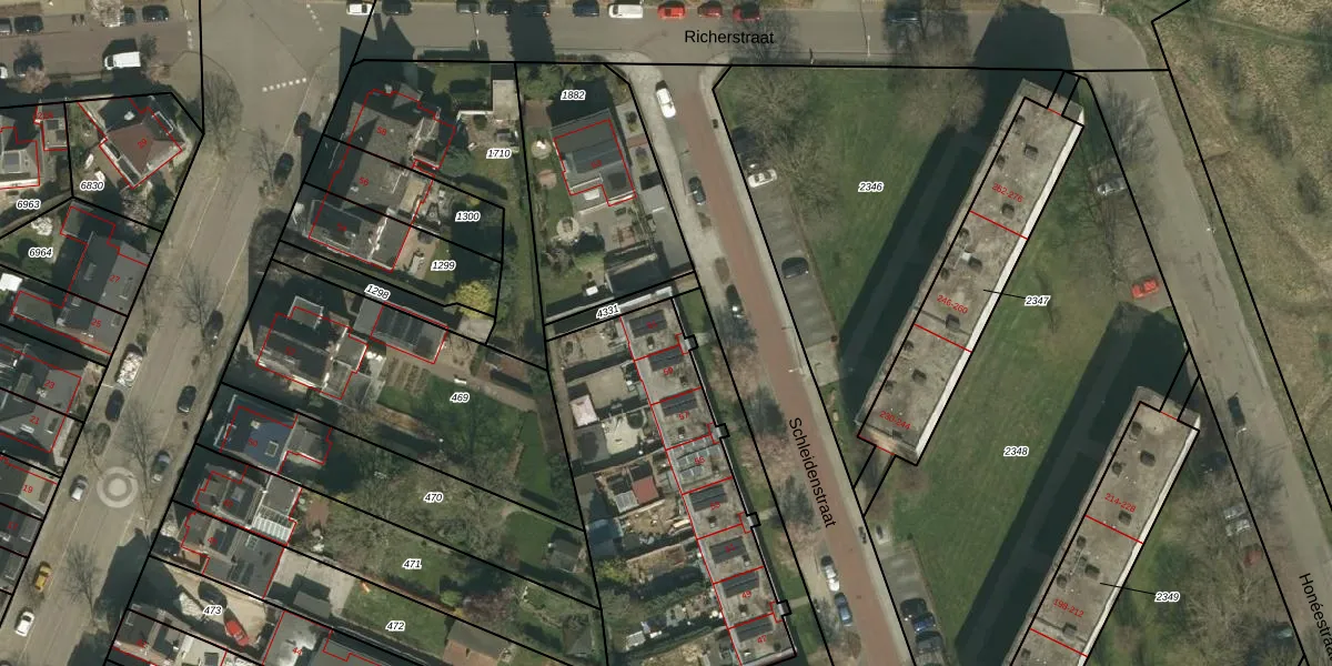Het perceel waarop Schleidenstraat 61 staat heeft een oppervlakte van 2980 m². Dit is een zeer groot perceel. De perceeloppervlakte wordt geregistreerd door het Kadaster. Gedetailleerde informatie over de maten van dit perceel kunt u vinden in het rapport Kadastrale kaart met maatvoering van Schleidenstraat 61.