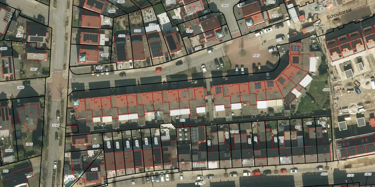 Het perceel waarop Schoutstraat 35 staat heeft een oppervlakte van 7321 m². Dit is een zeer groot perceel. De perceeloppervlakte wordt geregistreerd door het Kadaster. Gedetailleerde informatie over de maten van dit perceel kunt u vinden in het rapport Kadastrale kaart met maatvoering van Schoutstraat 35.