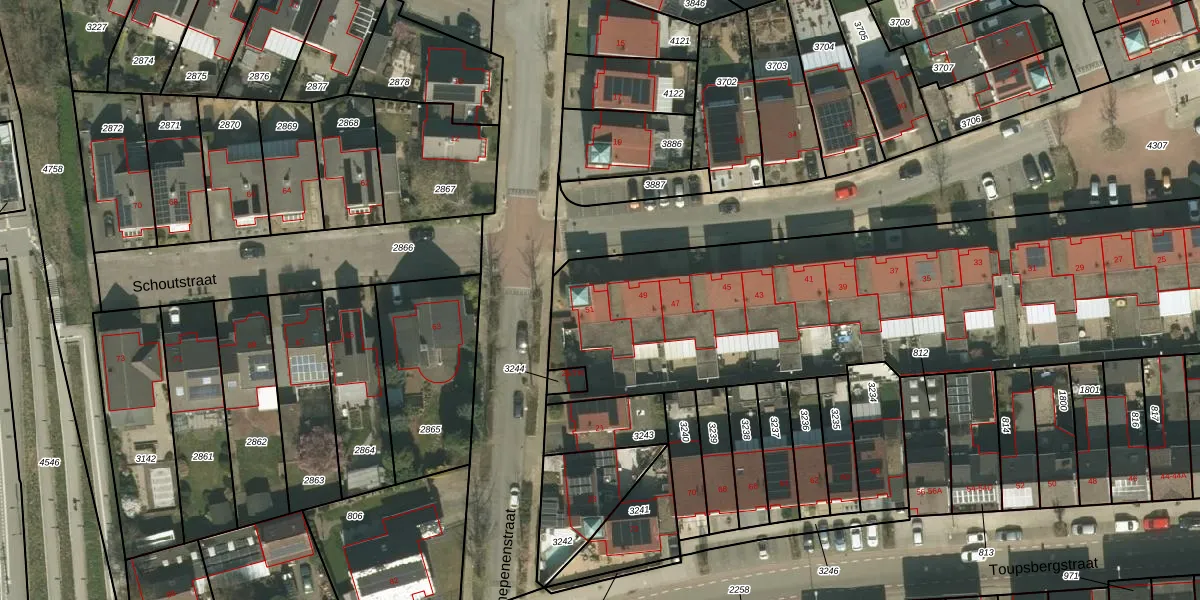 Het perceel waarop Schoutstraat 51 staat heeft een oppervlakte van 7321 m². Dit is een zeer groot perceel. De perceeloppervlakte wordt geregistreerd door het Kadaster. Gedetailleerde informatie over de maten van dit perceel kunt u vinden in het rapport Kadastrale kaart met maatvoering van Schoutstraat 51.