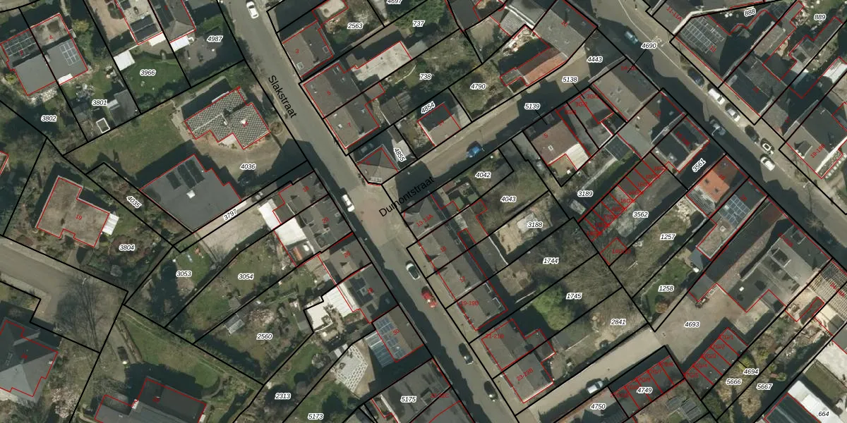 Slakstraat 13-A is gelegen op kadastraal perceel KRD00F4042. Deze kadastrale aanduiding is uniek en wordt gebruikt door het Kadaster om eigendomsrechten en andere zakelijke rechten vast te leggen. Het perceel maakt onderdeel uit van de kadastrale gemeente Kerkrade.