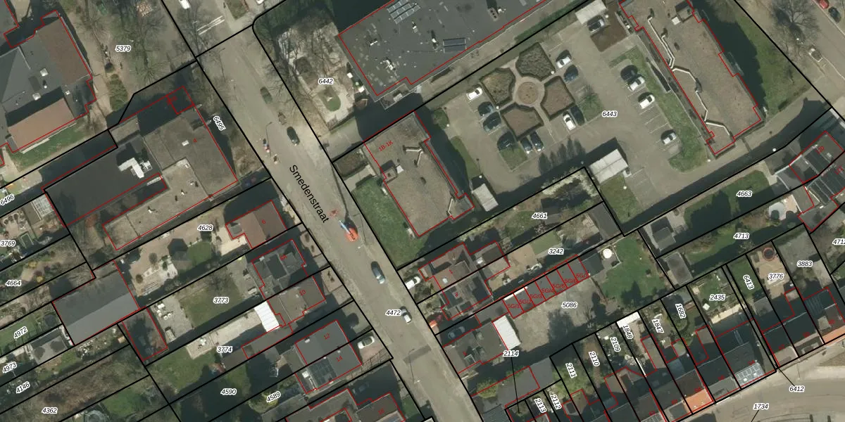 Het perceel waarop Smedenstraat 1-G staat heeft een oppervlakte van 4448 m². Dit is een zeer groot perceel. De perceeloppervlakte wordt geregistreerd door het Kadaster. Gedetailleerde informatie over de maten van dit perceel kunt u vinden in het rapport Kadastrale kaart met maatvoering van Smedenstraat 1-G.