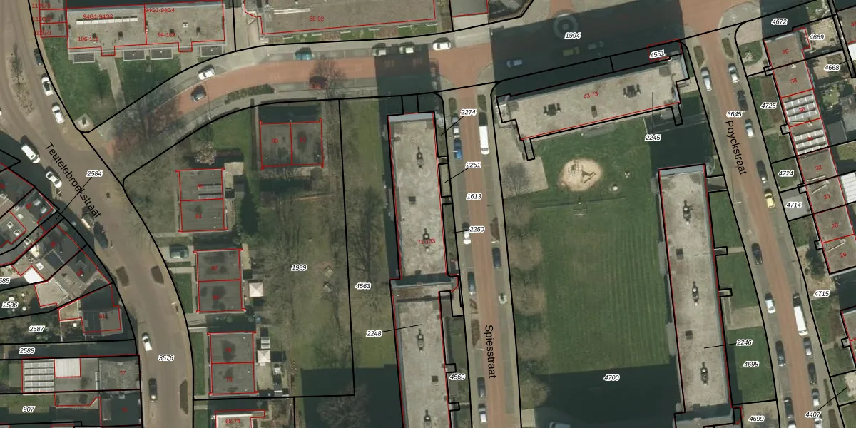 Het perceel waarop Spiesstraat 131 staat heeft een oppervlakte van 1200 m². Dit is een zeer groot perceel. De perceeloppervlakte wordt geregistreerd door het Kadaster. Gedetailleerde informatie over de maten van dit perceel kunt u vinden in het rapport Kadastrale kaart met maatvoering van Spiesstraat 131.