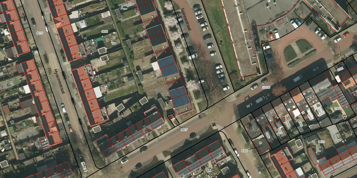 Het perceel waarop Spireastraat 43 staat heeft een oppervlakte van 8883 m². Dit is een zeer groot perceel. De perceeloppervlakte wordt geregistreerd door het Kadaster. Gedetailleerde informatie over de maten van dit perceel kunt u vinden in het rapport Kadastrale kaart met maatvoering van Spireastraat 43.