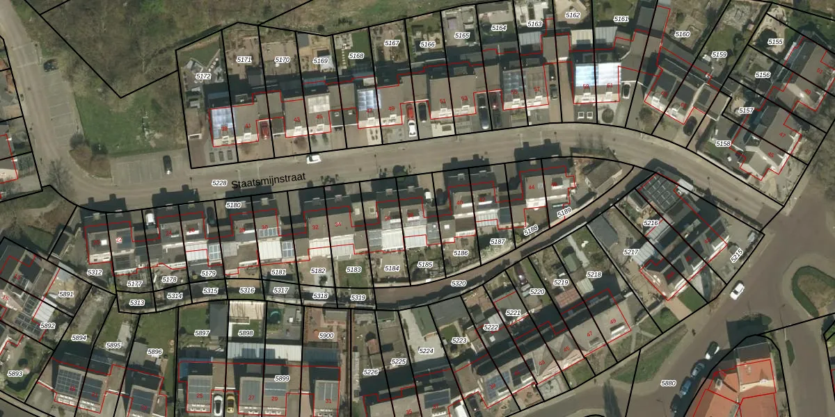 Het perceel waarop Staatsmijnstraat 38 staat heeft een oppervlakte van 229 m². Dit is een middelgroot perceel. De perceeloppervlakte wordt geregistreerd door het Kadaster. Gedetailleerde informatie over de maten van dit perceel kunt u vinden in het rapport Kadastrale kaart met maatvoering van Staatsmijnstraat 38.