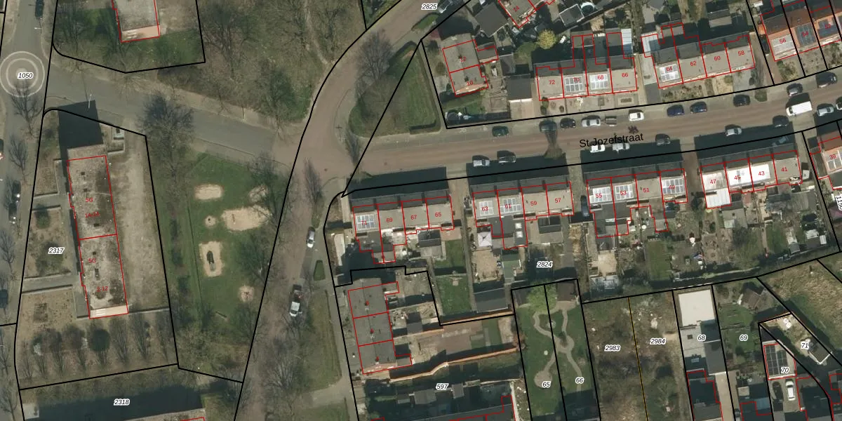 Het perceel waarop St.Jozefstraat 67 staat heeft een oppervlakte van 3462 m². Dit is een zeer groot perceel. De perceeloppervlakte wordt geregistreerd door het Kadaster. Gedetailleerde informatie over de maten van dit perceel kunt u vinden in het rapport Kadastrale kaart met maatvoering van St.Jozefstraat 67.