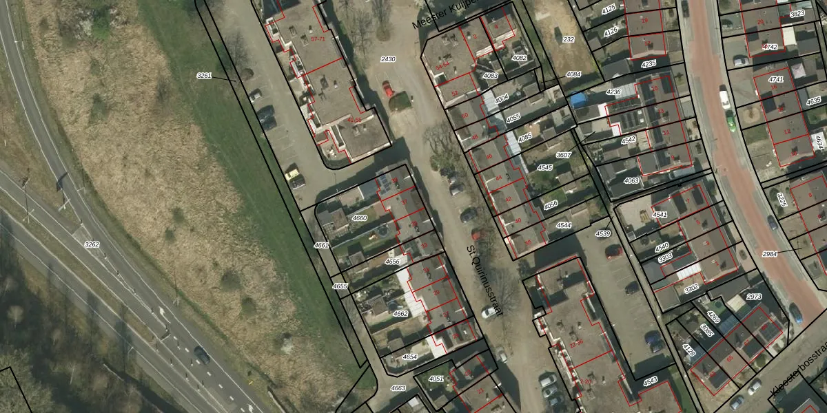 Het perceel waarop St.Quirinusstraat 37 staat heeft een oppervlakte van 434 m². Dit is een groot perceel. De perceeloppervlakte wordt geregistreerd door het Kadaster. Gedetailleerde informatie over de maten van dit perceel kunt u vinden in het rapport Kadastrale kaart met maatvoering van St.Quirinusstraat 37.