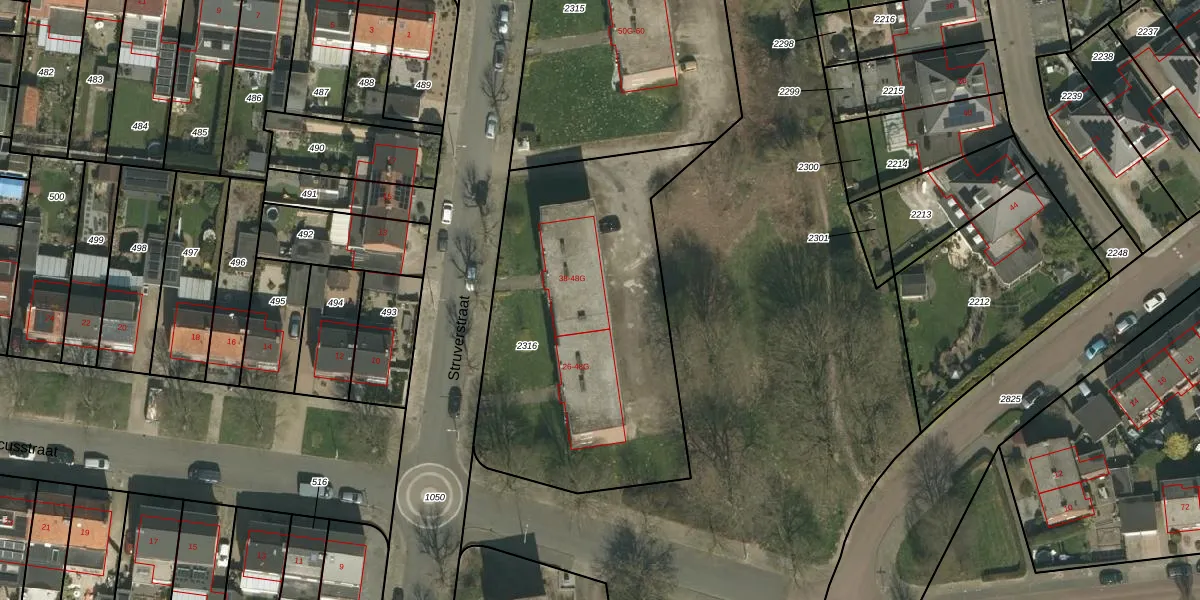 Struverstraat 48-G-5 is gelegen op kadastraal perceel KRD00H2316. Deze kadastrale aanduiding is uniek en wordt gebruikt door het Kadaster om eigendomsrechten en andere zakelijke rechten vast te leggen. Het perceel maakt onderdeel uit van de kadastrale gemeente Kerkrade.