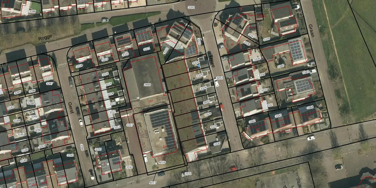 Het perceel waarop Tarwe 9 staat heeft een oppervlakte van 168 m². Dit is een middelgroot perceel. De perceeloppervlakte wordt geregistreerd door het Kadaster. Gedetailleerde informatie over de maten van dit perceel kunt u vinden in het rapport Kadastrale kaart met maatvoering van Tarwe 9.