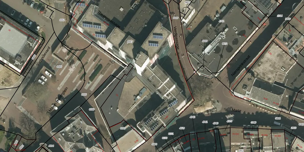 Het perceel waarop Theaterpassage 44 staat heeft een oppervlakte van 5197 m². Dit is een zeer groot perceel. De perceeloppervlakte wordt geregistreerd door het Kadaster. Gedetailleerde informatie over de maten van dit perceel kunt u vinden in het rapport Kadastrale kaart met maatvoering van Theaterpassage 44.