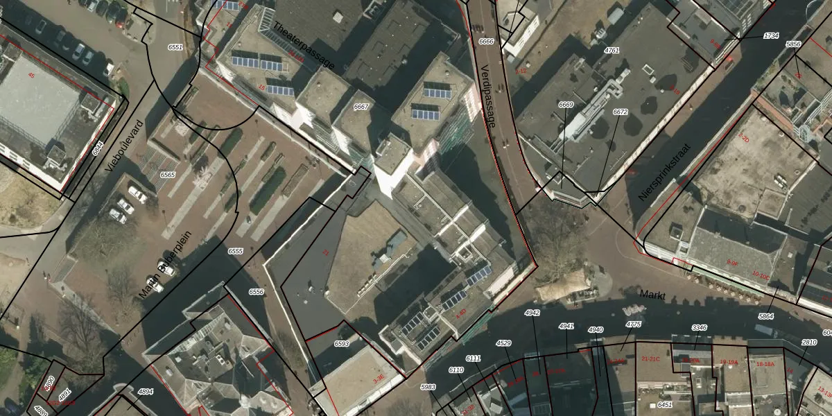 Het perceel waarop Theaterpassage 90 staat heeft een oppervlakte van 5197 m². Dit is een zeer groot perceel. De perceeloppervlakte wordt geregistreerd door het Kadaster. Gedetailleerde informatie over de maten van dit perceel kunt u vinden in het rapport Kadastrale kaart met maatvoering van Theaterpassage 90.
