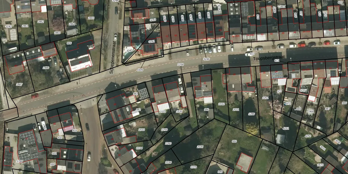 Het perceel waarop Toupsbergstraat 45 staat heeft een oppervlakte van 258 m². Dit is een middelgroot perceel. De perceeloppervlakte wordt geregistreerd door het Kadaster. Gedetailleerde informatie over de maten van dit perceel kunt u vinden in het rapport Kadastrale kaart met maatvoering van Toupsbergstraat 45.