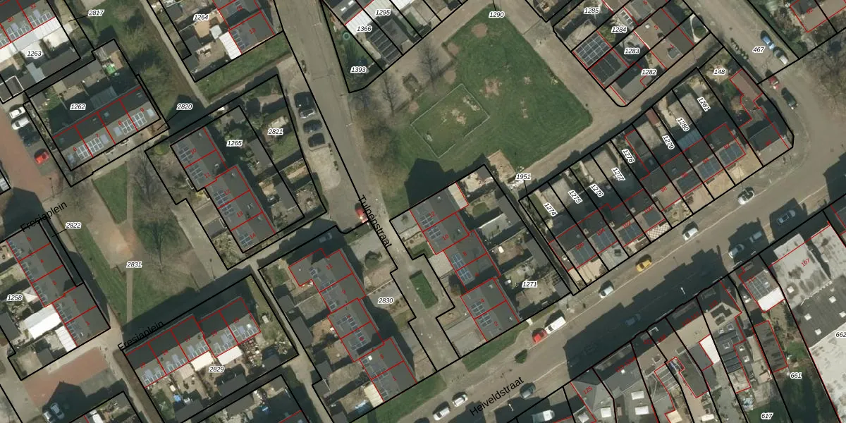 Het perceel waarop Tulpenstraat 12 staat heeft een oppervlakte van 976 m². Dit is een groot perceel. De perceeloppervlakte wordt geregistreerd door het Kadaster. Gedetailleerde informatie over de maten van dit perceel kunt u vinden in het rapport Kadastrale kaart met maatvoering van Tulpenstraat 12.