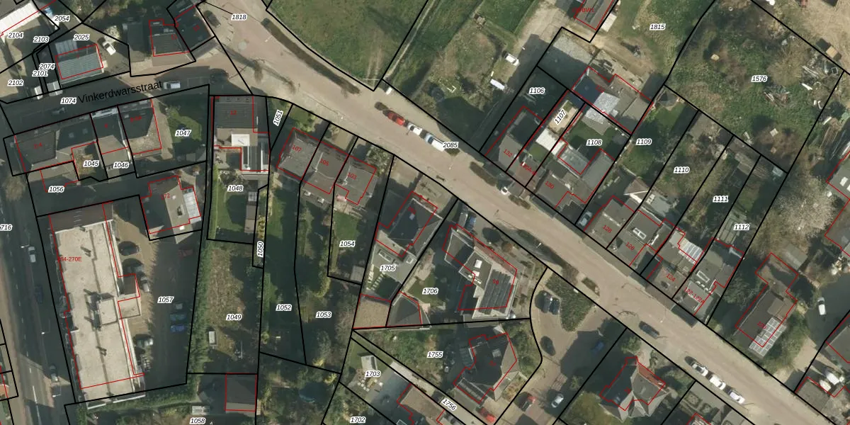 Het perceel waarop Vinkerstraat 101 staat heeft een oppervlakte van 454 m². Dit is een groot perceel. De perceeloppervlakte wordt geregistreerd door het Kadaster. Gedetailleerde informatie over de maten van dit perceel kunt u vinden in het rapport Kadastrale kaart met maatvoering van Vinkerstraat 101.