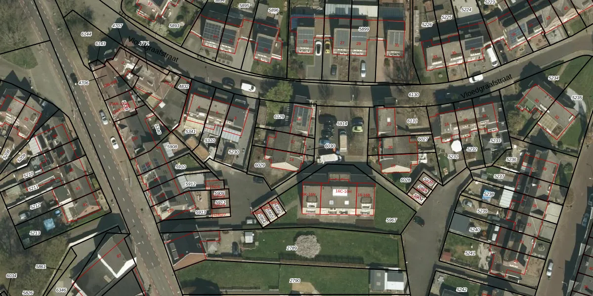 Vloedgraafstraat 12 is gelegen op kadastraal perceel KRD00A6030. Deze kadastrale aanduiding is uniek en wordt gebruikt door het Kadaster om eigendomsrechten en andere zakelijke rechten vast te leggen. Het perceel maakt onderdeel uit van de kadastrale gemeente Kerkrade.