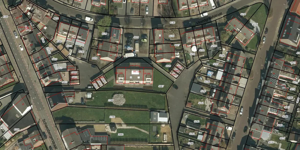 Vloedgraafstraat 16-B is gelegen op kadastraal perceel KRD00A5967. Deze kadastrale aanduiding is uniek en wordt gebruikt door het Kadaster om eigendomsrechten en andere zakelijke rechten vast te leggen. Het perceel maakt onderdeel uit van de kadastrale gemeente Kerkrade.