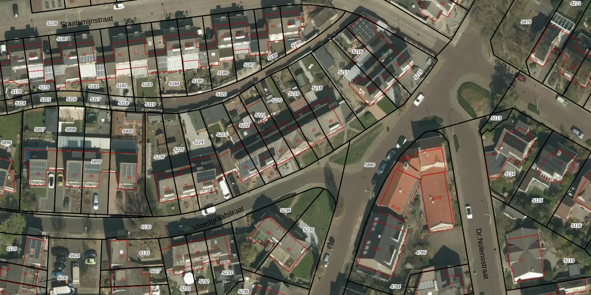 Vloedgraafstraat 45 is gelegen op kadastraal perceel KRD00A5220. Deze kadastrale aanduiding is uniek en wordt gebruikt door het Kadaster om eigendomsrechten en andere zakelijke rechten vast te leggen. Het perceel maakt onderdeel uit van de kadastrale gemeente Kerkrade.