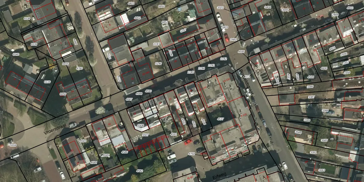 Vroenstraat 21 is gelegen op kadastraal perceel KRD00F4593. Deze kadastrale aanduiding is uniek en wordt gebruikt door het Kadaster om eigendomsrechten en andere zakelijke rechten vast te leggen. Het perceel maakt onderdeel uit van de kadastrale gemeente Kerkrade.