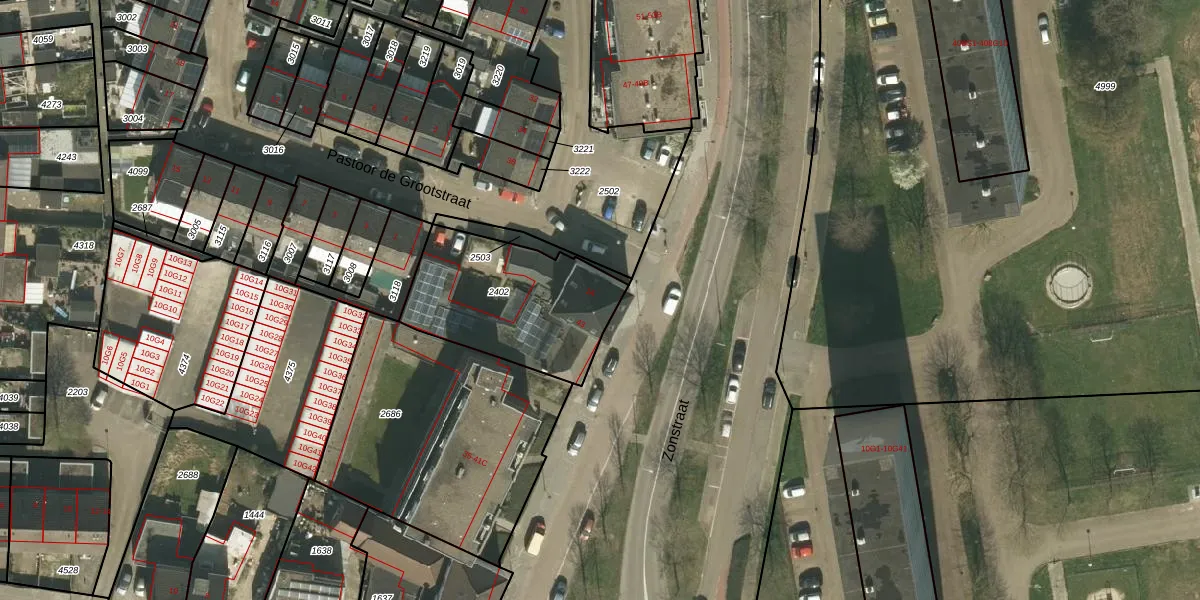 Zonstraat 43 is gelegen op kadastraal perceel KRD00G2402. Deze kadastrale aanduiding is uniek en wordt gebruikt door het Kadaster om eigendomsrechten en andere zakelijke rechten vast te leggen. Het perceel maakt onderdeel uit van de kadastrale gemeente Kerkrade.