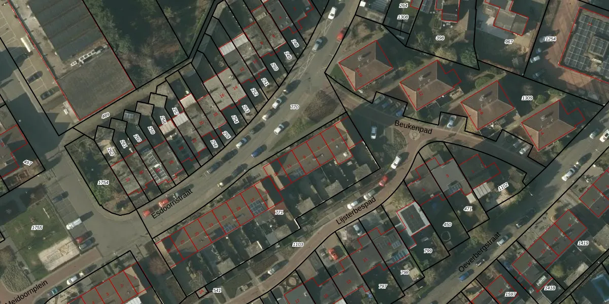 Het perceel waarop Esdoornstraat 9 staat heeft een oppervlakte van 1720 m². Dit is een zeer groot perceel. De perceeloppervlakte wordt geregistreerd door het Kadaster. Gedetailleerde informatie over de maten van dit perceel kunt u vinden in het rapport Kadastrale kaart met maatvoering van Esdoornstraat 9.