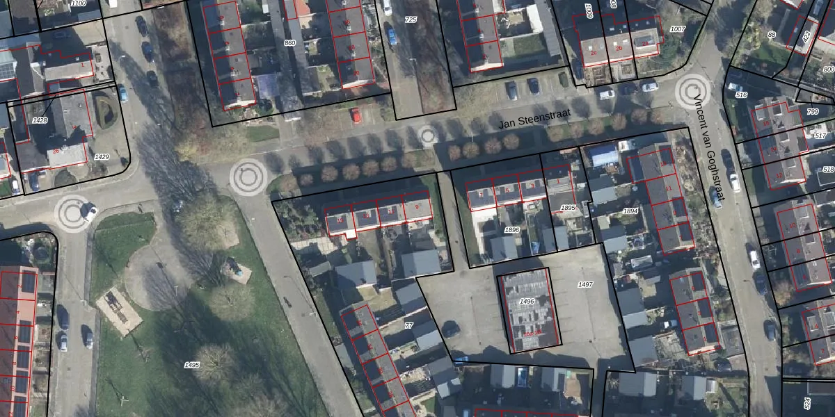 Het perceel waarop Jan Steenstraat 9 staat heeft een oppervlakte van 2674 m². Dit is een zeer groot perceel. De perceeloppervlakte wordt geregistreerd door het Kadaster. Gedetailleerde informatie over de maten van dit perceel kunt u vinden in het rapport Kadastrale kaart met maatvoering van Jan Steenstraat 9.