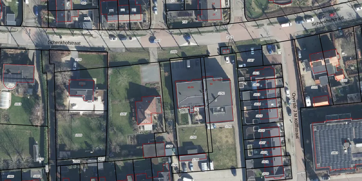 Het perceel waarop Schenkhofstraat 6-b staat heeft een oppervlakte van 900 m². Dit is een groot perceel. De perceeloppervlakte wordt geregistreerd door het Kadaster. Gedetailleerde informatie over de maten van dit perceel kunt u vinden in het rapport Kadastrale kaart met maatvoering van Schenkhofstraat 6-b.